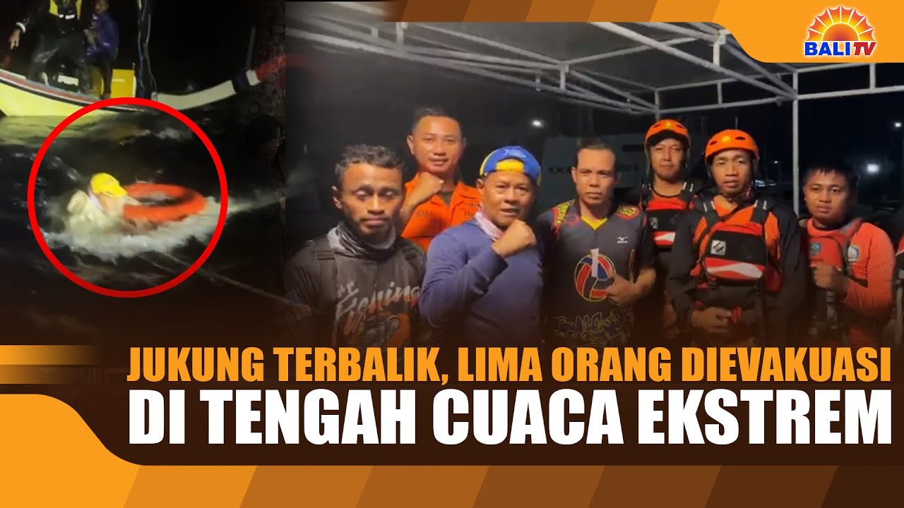 HANTAMAN GELOMBANG LAUT MENGAKIBATKAN JUKUNG TERBALIK, DAN 5 ORANG TEROMBANG-AMBING DI TENGAH LAUT PERAIRAN NUSA DUA, SENIN 15 DESEMBER 2025 MALAM. UNTUNGNYA, KORBAN BERHASIL DISELAMATKAN TIM SAR, DALAM KONDISI CUACA EKSTREM DI LAUT.